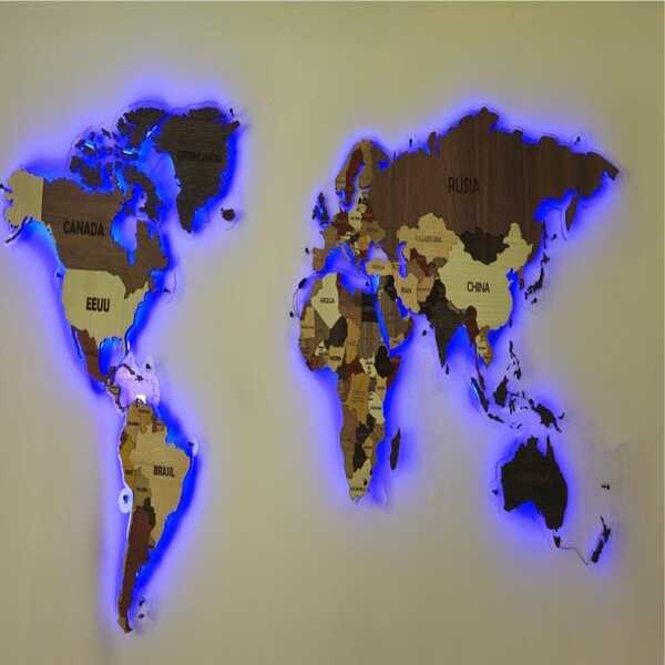 Este exclusivo mapamundi combina diseño y funcionalidad, ideal para realzar cualquier espacio. Con una base de acrílico transparente, países en MDF de alta calidad y bordes iluminados en LED azul que simulan los océanos, este mapa es una pieza única que destaca por su elegancia y modernidad. Disponible en 3 tamaños para adaptarse perfectamente a tu hogar u oficina. Incluye una caja de madera para su fácil almacenamiento y transporte.